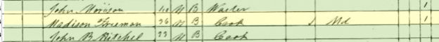 John Morrison, age 45, male, mulatto, hotel waiter, owns house worth $600, personal property worth $100, born South America (probably meaning the American South rather than the continent of South America).