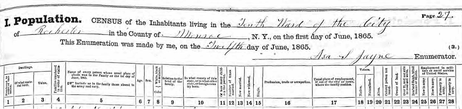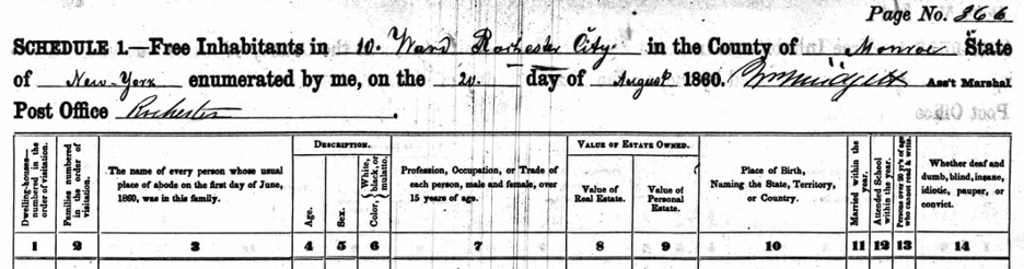 Wooden house worth $600, $150 personal property, John Morrison, aged 45, mulatto, married, born in Maryland, lived in Rochester for seven years, waiter