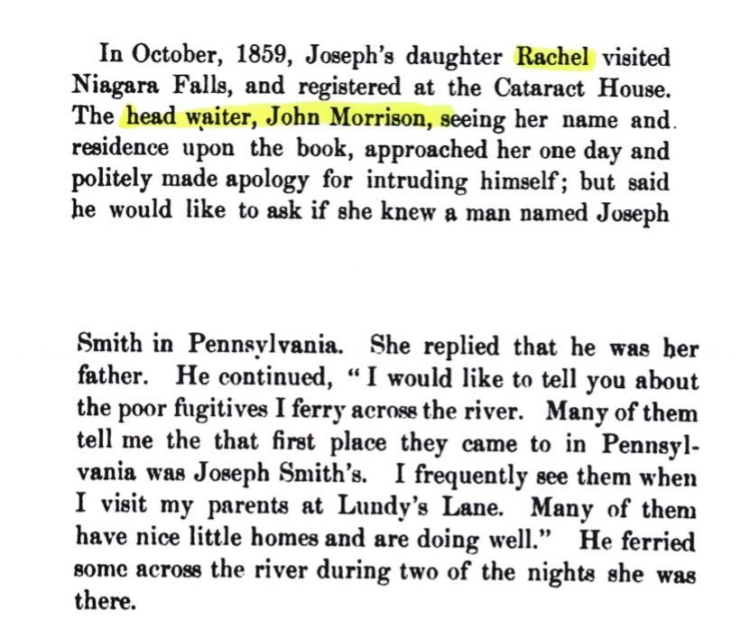[Morrison] continued, “I would like to tell you about the poor fugitives I ferry across the river. Many of them tell me the that first place they came to in Pennsylvania was Joseph Smith's. I frequently see them when I visit my parents at Lundy's Lane. Many of them have nice little homes and are doing well.” He ferried some across the river during two of the nights she was there.