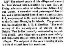 John Morrison was well-respected by both Black and white communities in Niagara Falls. In 1856, for example, “colored people of this village and a number from abroad” celebrated Emancipation Day. This was the anniversary of the Slavery Abolition Law that freed most of the slaves in the British Empire on August 1, 1834. It was celebrated on both sides of the US-Canadian border up to the time of the Civil War. Those celebrating held a meeting in Union Hall, at the corner of Falls and Mechanic Streets, with a speech by General Gaines, a well-known African American from Lewiston. L.H.F. Hamilton, a Black business owner in Niagara Falls, presented a gold-topped cane to John W. Morrison, head waiter at the Cataract House. “The recipient of the cane is worthy of such a mark of respect from his associates,” noted the Niagara Falls Gazette.