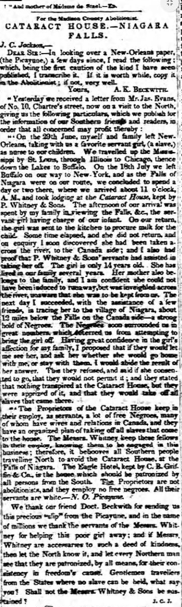 “An Abduction at Niagara Falls.—Our Buffalo correspondent, to-day, relates a story of the abduction of a female servant from a southern gentleman, who visited Niagara Falls, and stopped at the Cataract House. His statement we know to be a fact. We have seen the gentleman to whom the girl belonged, and he has confirmed every particular. He is from New Orleans.