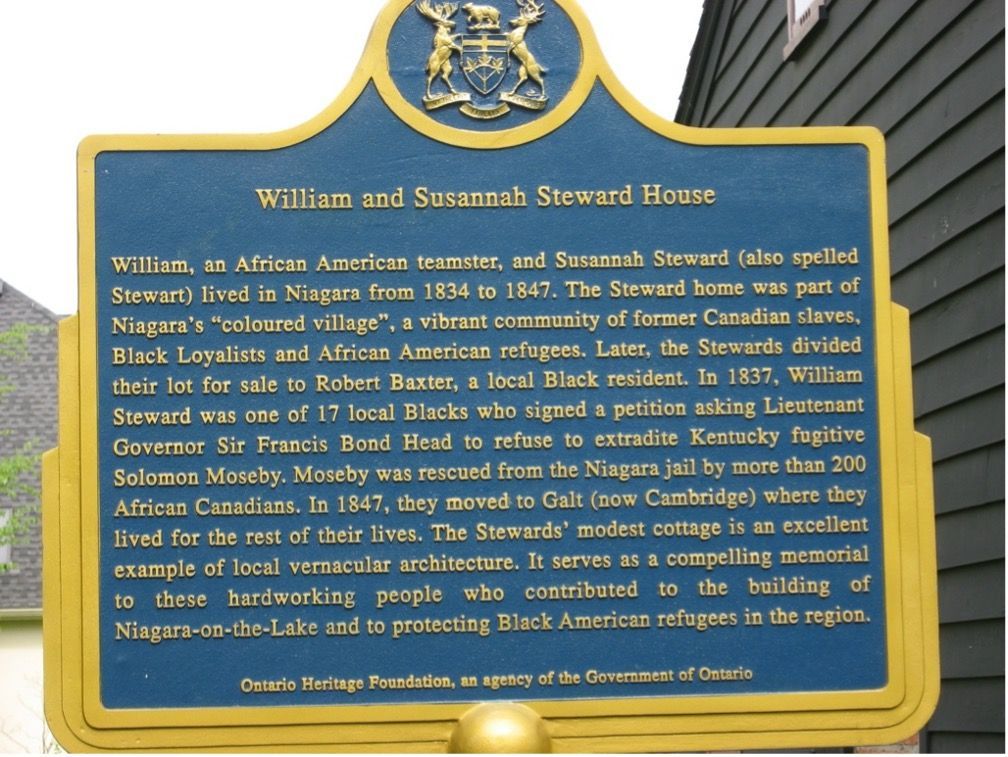 William and Susannah Steward lived in the “coloured village” of Niagara-on-the-Lake from 1834 to 1847. When the Evans girl escaped from slavery, she may have stayed in this house or one very much like it. Karolyn Smardz Frost wrote the text for this plaque erected by the Ontario Heritage Foundation.