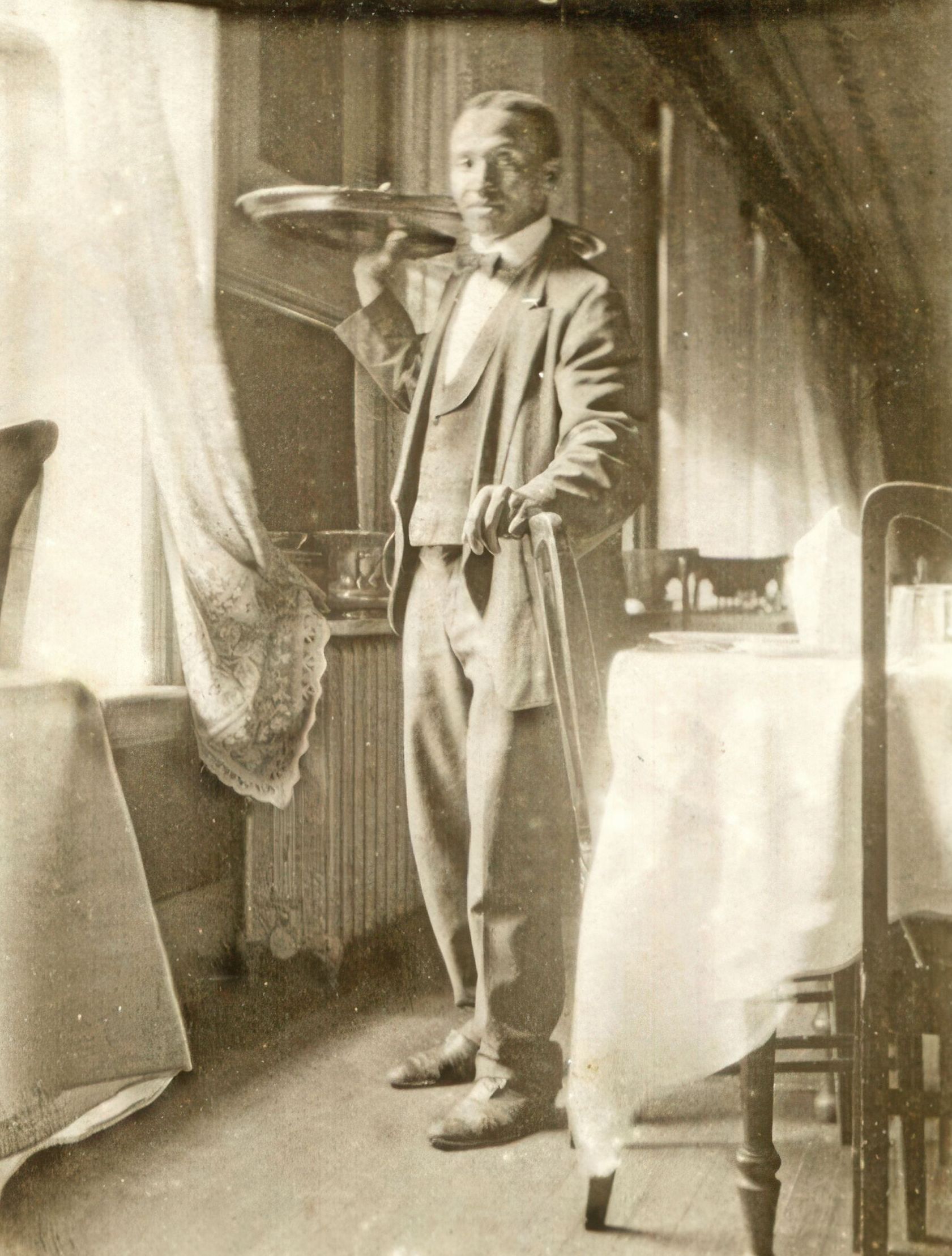 Waiter, Unknown location, n.d. Found by Ally Spongr DeGon. This is one of the few images of a hotel waiter of African descent in the nineteenth century. This may or may not have been taken in the dining room of the Cataract House. His dress is formal, with a bow tie and leather shoes. He holds a tray over his shoulder and looks directly at the camera, confident in his work.